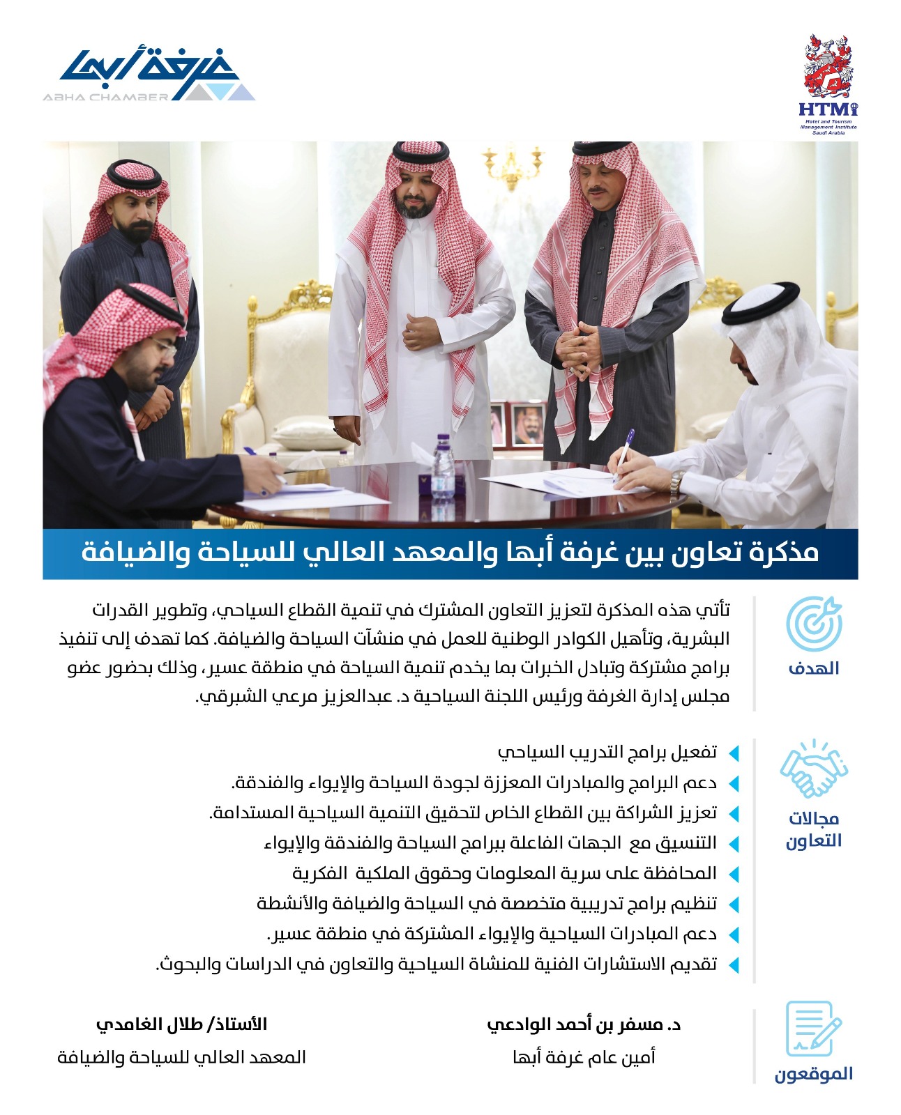 Abha Chamber signed a cooperation memorandum with HTMi Saudi Arabia to empower national talents and enhance the readiness of the tourism sector in the region.